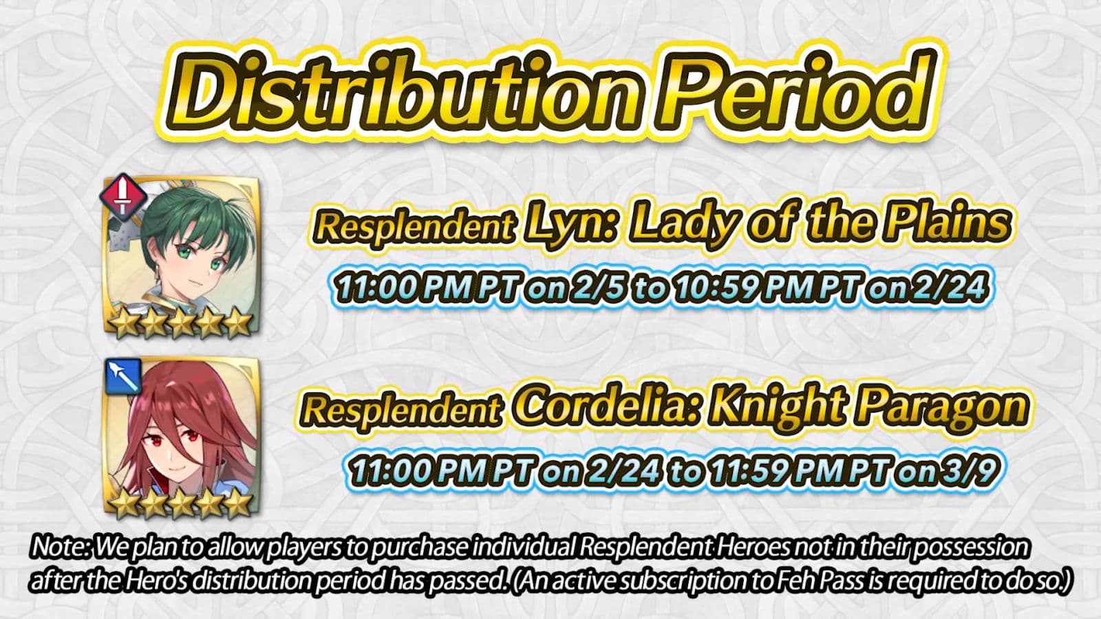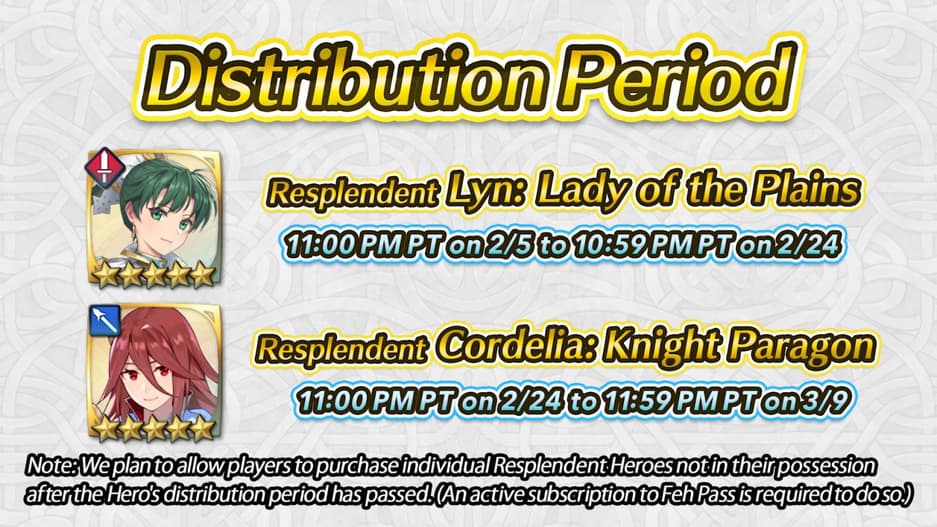 Подписчики получат «блистательных персонажей» - улучшенные версии уже существующих героев из Fire Emblem Heroes примечательные эффектными нарядами и повышенными (на две единицы) характеристиками. «Блистательных персонажей» будут раздавать подписчикам дважды в месяц. Возможно, подписчикам позволят приобретать усиленных персонажей отдельно после завершения периода раздачи.