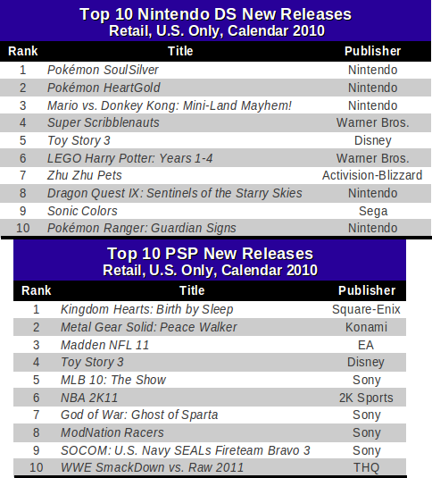Половина игр в Top 10 для DS была выпущена Nintendo, лидировали эксклюзивные покемоны. Лучшими играми для PSP были также были эксклюзивы: Kingdom Hearts: Birth by Sleep и Metal Gear Solid: Peace Walker.