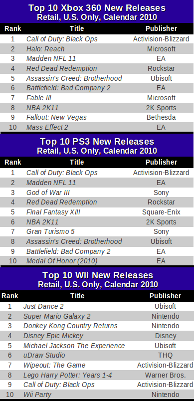 Шутер Call of Duty: Black Ops занял первые места в чартах игр для PS3 и Xbox 360 и девятое место - в списке лучших игр для Wii. В Top 10 для Xbox 360 попали три эксклюзива, включая Mass Effect 2, который вышел на PS3 в 2011 году. Самым продаваемым эксклюзивом Xbox 360 в США был шутер Halo: Reach.