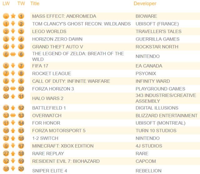 Компания Chart-track опубликовала свежие данные о продажах игр на территории Соединённого королевства. На первом месте дебютировала ролевая игра Mass Effect: Andromeda. Это первый проект от ЕА со времён FIFA 17, которому удалось взобраться на первую сточку британского чарта продаж.