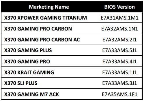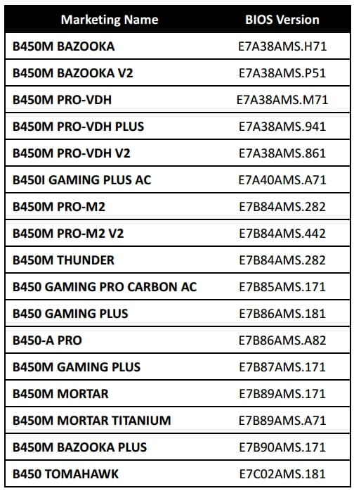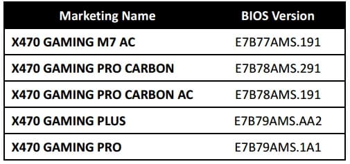 Ниже представлен список версий прошивки BIOS, которые призваны сделать материнские платы MSI 300-й и 400-й серий совместимыми с процессорами AMD следующего поколения. Появление данных версий BIOS ожидается в мае этого года.