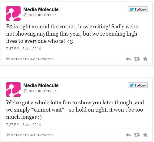 Однако сами разработчики уже опровергли эту информацию на своей twitter-страничке, заявив, что Media Molecule ничего не будет представлять на грядущей выставке. Впрочем, они намекнули, что анонс игры все равно состоится довольно скоро - это позволяет предположить, что речь идет об августовской выставке gamescom 2014.