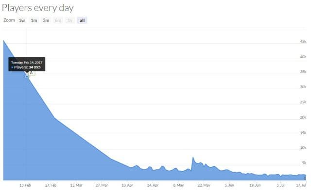В марте мы сообщали о том, что игра с момента релиза 14 февраля стремительно теряет популярность. Данную информацию можно легко проверить с помощью сервиса SteamDB. Согласно порталу, в день релиза, 14 февраля, в игре было около 34 тысяч пользователей. Спустя месяц их количество снизилось до 14 тысяч. На момент публикации новости в игре находится 950 игроков. Чуть менее 3% изначальной базы.