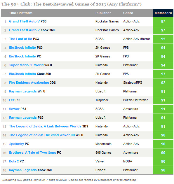 В чарте самых высоко оцененных игр лидировали Grand Theft Auto V, The Last of Us, BioShock Infinite, Super Mario 3D World, Fire Emblem: Awakening и другие проекты, перечисленные ниже.