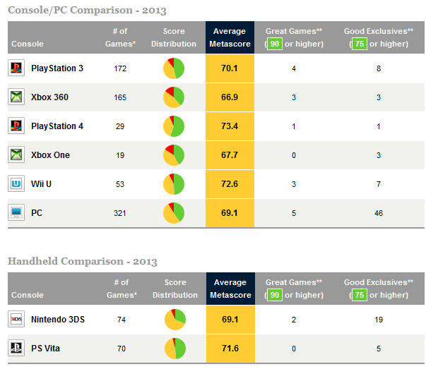 Лидером среди консолей оказалась PS4 со средним баллом 73,4/100, следом за ней идет Wii U - 72,6/100, третье место досталось PS3 - 70,1/100. Далее идут PC - 69,1/100, Xbox One - 67,7/100 и Xbox 360 - 66,9/100. PS Vita немного опередила 3DS по среднему баллу, зато значительно уступила по количеству хорошо оцененных игр.