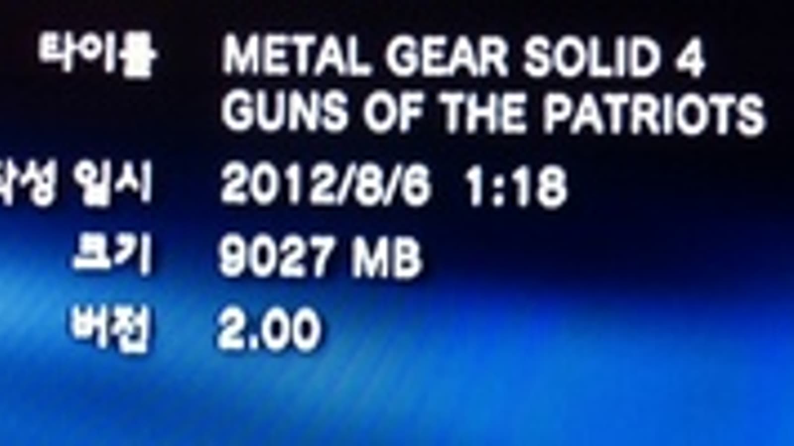 Размер обновления составляет 516 МБ, патч обновляет игру до версии 2.0 и добавляет в Metal Gear Solid 4: Guns of the Patriots 34 трофея. Объем полной инсталляции игры составляет 9 ГБ, на всю установку уходит порядка 16 минут.