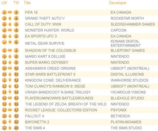 Вторую неделю подряд и в шестой раз с момента выхода, FIFA 18 засветилась на первом месте рейтинга физических продаж игр на территории Великобритании, закончившуюся 24 сентября. GTA V поднялась до второй позиции, а третью строчку занимает Call of Duty: WWII.