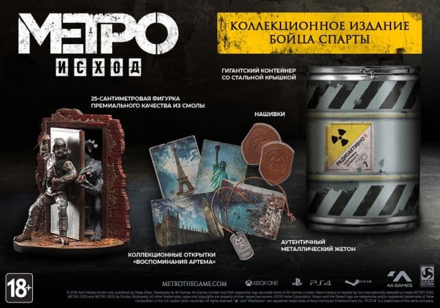 Deep Silver и 4A Games представили лимитированное издание тиражом 4 тысячи экземпляров грядущего шутера Metro Exodus под названием «Коллекционное издание бойца Спарты» (Spartan Collector’s Edition). Коллекционное издание включает в себя: