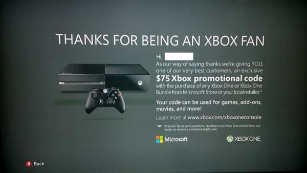 Пользователь NeoGaf под ником BeforeU включил свою консоль Xbox 360, чтобы просто поиграть в Halo, но сначала он увидел сообщение о том, что ему, как преданному поклоннику, полагается 75-долларовый бонус в случае покупки Xbox One.