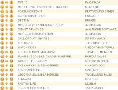 Middle Earth: Shadow of Mordor стартовала на второй строчке, продемонстрировав самый успешный старт для игры по вселенной The Lord of the Rings. 56% копий игры купили владельцы PS4, 41% - Xbox One и 3% - пользователи РС. Гоночная игра Forza Horizon 2 заняла третье место (73% продаж сделали владельцы Xbox One, 27% - Xbox 360). Super Smash Bros. для 3DS оказался на четвертом месте.
