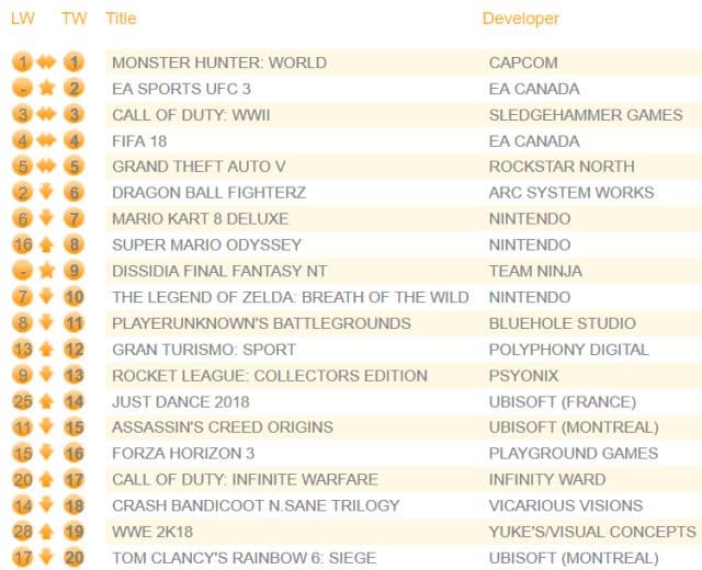 В сети появились данные о продажах физических версий игр на территории Британии за прошлую неделю. На первом месте осталась боевая ролевая игра Monster Hunter World, продажи которой снизились на 46% по сравнению с предыдущей неделей. Симулятор смешанных единоборств UFC 3 от Electronic Arts стартовал на втором месте.