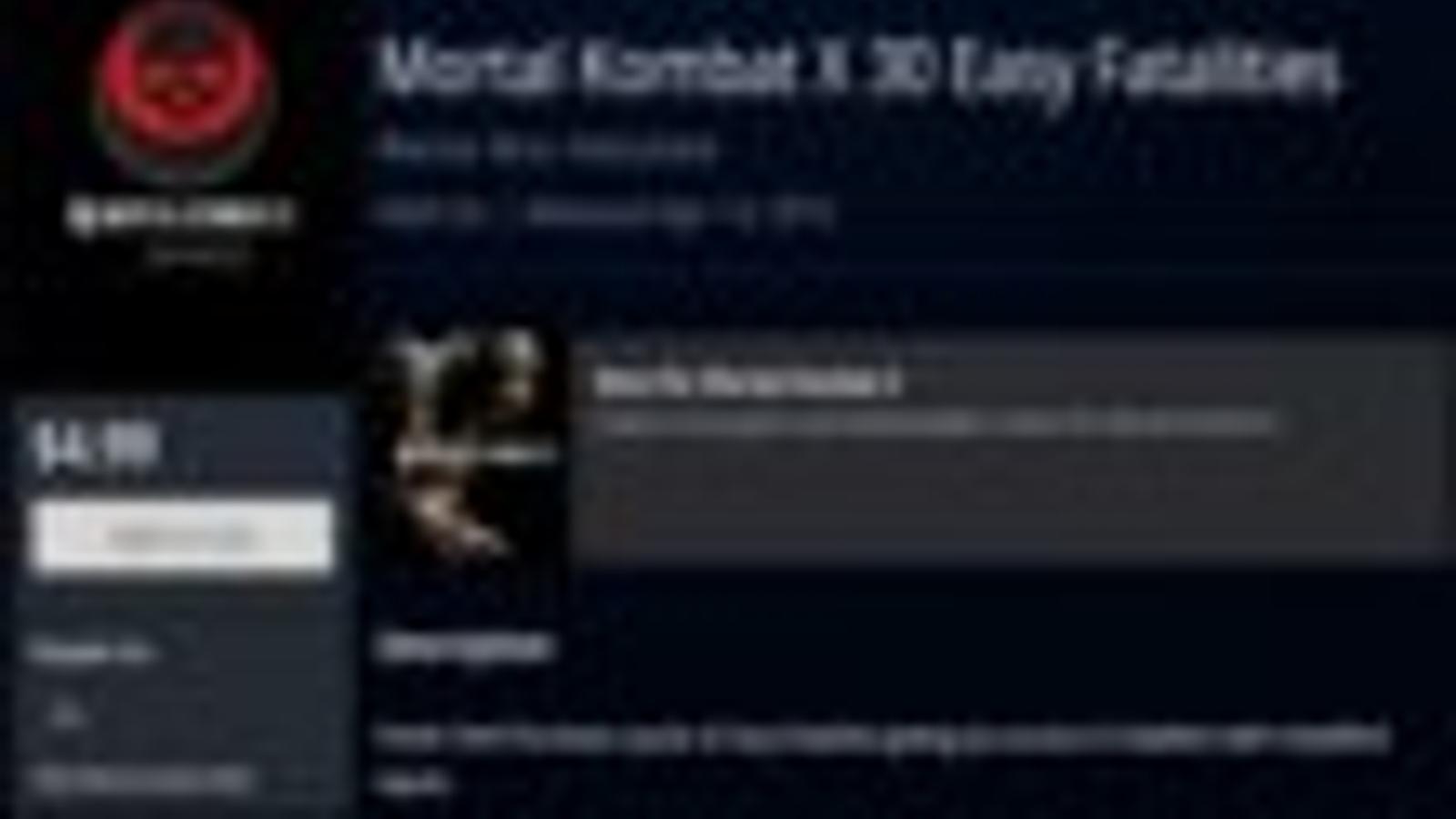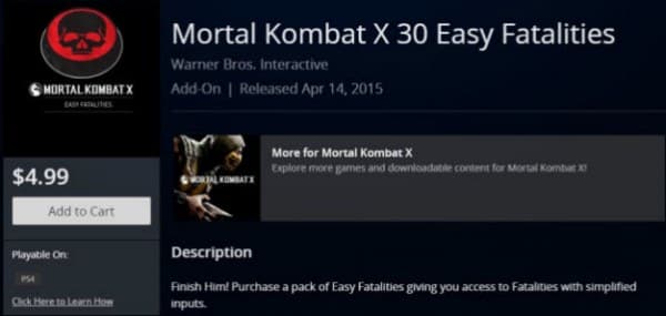 Сегодня, одновременно с релизом игры, в PS Store появились наборы Mortal Kombat X 30 Easy Fatalities ($4,99) и Mortal Kombat X 5 Easy Fatalities ($0,99), которые позволяют получить доступ к соответствующему количеству легких фаталити.