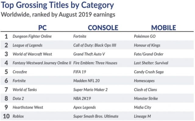 Ниже представлены списки из 10 самых успешных игр на РС, консолях и мобильных устройствах, согласно данным SuperData, за август этого года: