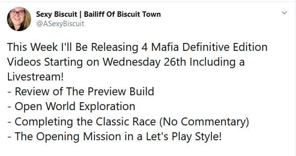 YouTube-блогер Sexy Biscuit сообщила о том, что в среду, 26 августа, в сети появятся превью-материалы по ремейку первой части Mafia.