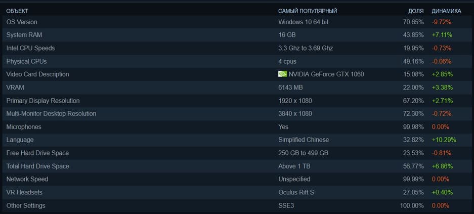 Что касается виртуальной реальности, то самым популярным VR-шлемом является Oculus Rift S (27,05%), потом идёт HTC Vive (26,67%), Oculus Rift (15,56%) и Valve Index HMD (10,94%).