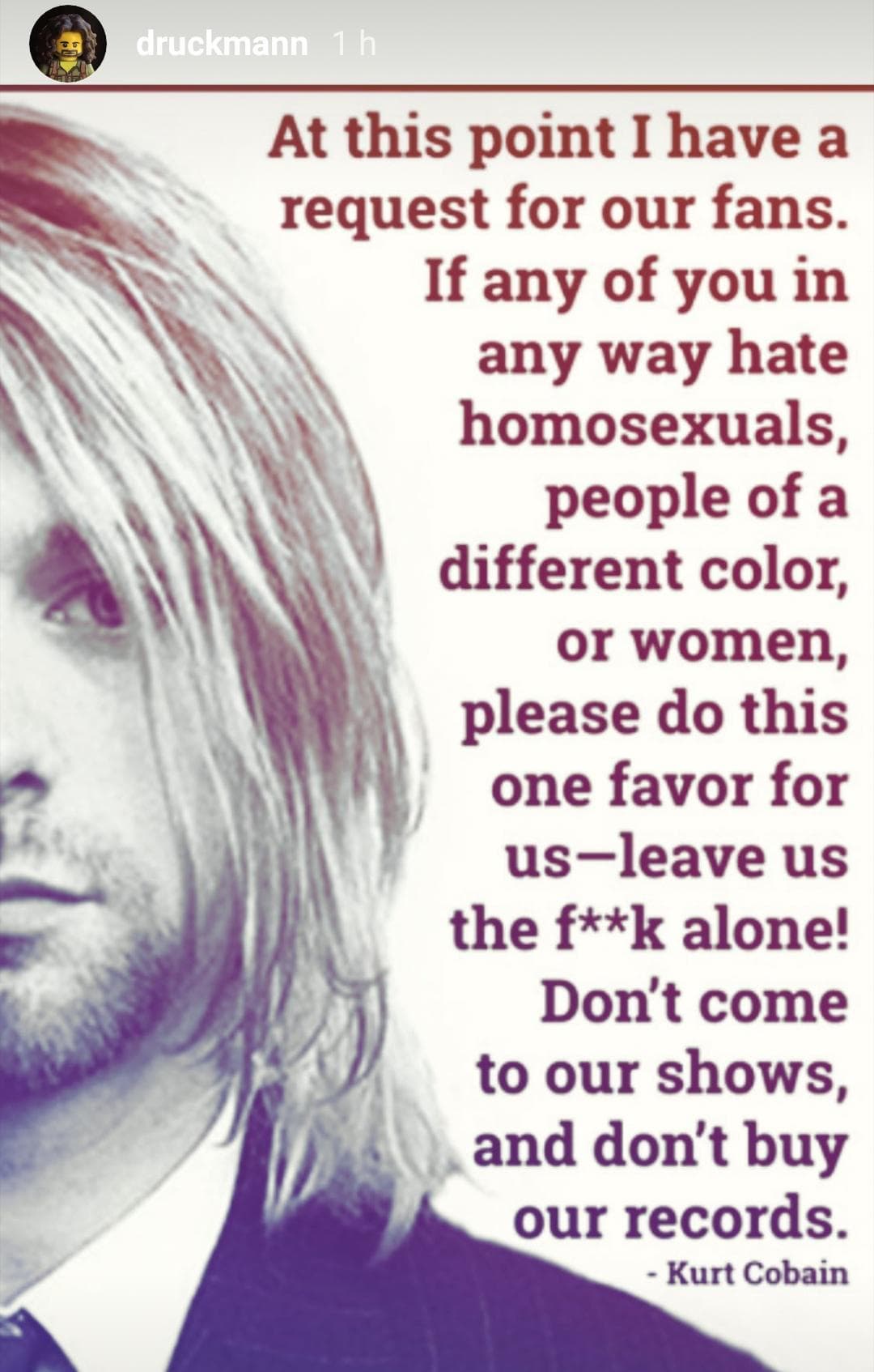 «В данный момент у меня есть просьба к нашим фанатам. Если кто-то из вас в какой либо форме ненавидит гомосексуалистов, людей с другим цветом кожи или женщин, то, пожалуйста, сделайте нам одолжение – оставьте нас б…ь в покое! Не ходите на наши концерты, не покупайте наши записи», - говорил когда-то Курт Кобейн.