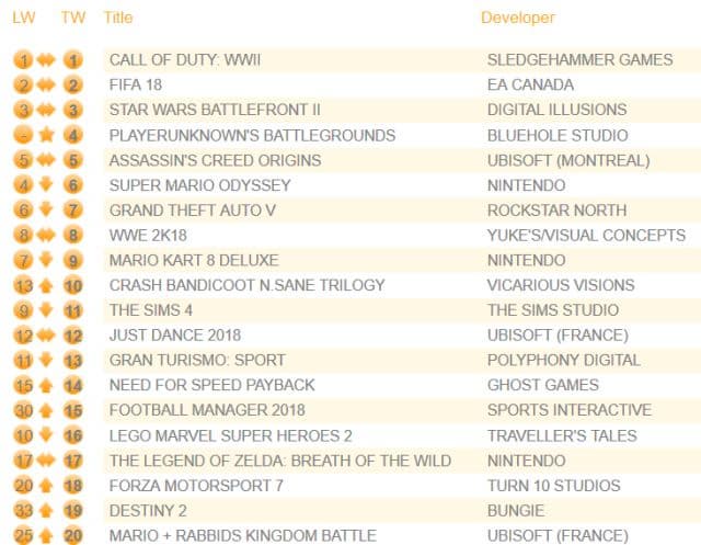 В сети появились данные о продажах игр на территории Соединённого королевства за прошлую неделю. На первом месте остался шутер Call of Duty: WWII, который лидирует в Британии уже седьмую неделю подряд. На втором месте остался футбольный симулятор FIFA 18, а шутер Star Wars Battlefront II не сдвинулся с третьей строчки. Отмечается «огромный всплеск» продаж Battlefront II, чему способствовал выход в прокат фильма «Звёздные войны: Последние джедаи».