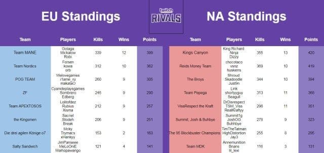 В Северной Америке победила команда Kings Canyon, в состав которой вошли известные стримеры Ninja, King Richard и Dizzy, со счётом 420 очков.