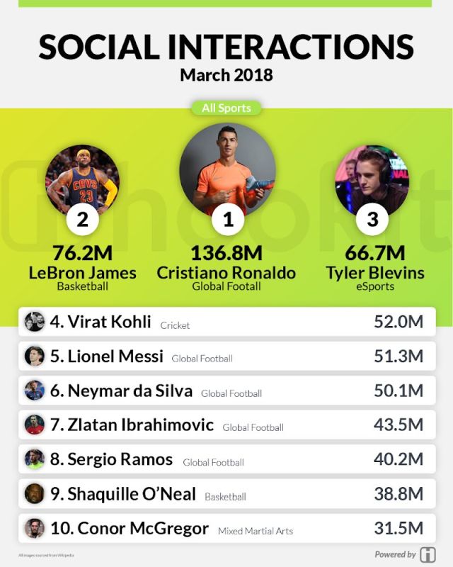 Стример Fortnite Тайлер Блевинс, известный, как Ninja, согласно статистике Facebook, Instagram и Twitter, в марте 2018 года оказался третьим по популярности после футболиста Криштиану Рональдо и баскетболиста Леброна Джеймса. По количеству упоминаний он обогнал даже самого Лионеля Месси. Его имя в течение прошлого месяца 66,7 млн. раз было замечено в указанных социальных сетях, при том, что у него "всего" 3,2 млн. последователей (followers). У Джеймса и Рональдо, к слову, их более 100 млн., но Блевинс обрёл известность совсем недавно. Помимо Ninja, в сотне самых популярных звёзд спорта отсутствуют «киберспортсмены».