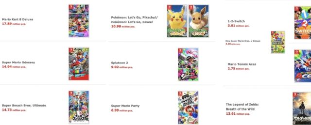 Благодаря интересу к Switch, было продано 210,13 млн. игр, из них 2,42 млн. во втором квартале. Самой продаваемой остаётся Mario Kart 8 Deluxe – 17,89 млн. На втором месте Super Mario Odyssey – 14,94 млн. На третьем - Super Smash Bros. Ultimate и 14,73 млн.