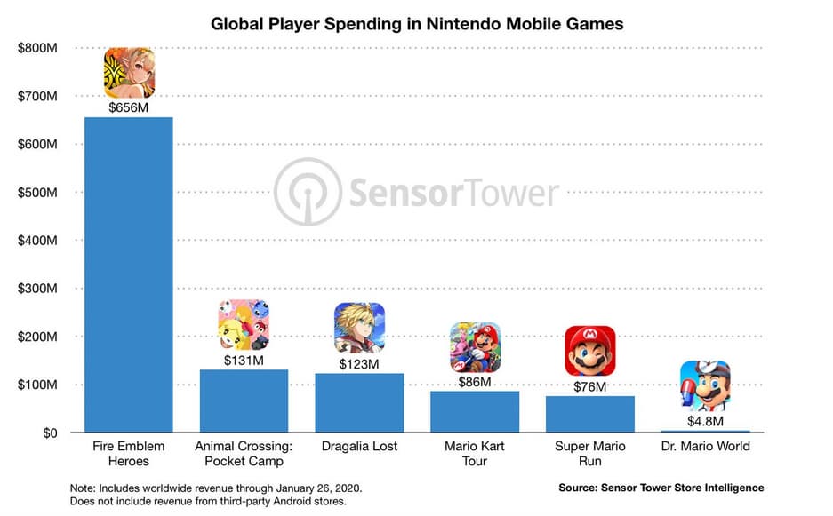 Исследовательская группа Sensor Tower сообщает, что гигант уже заработал свой первый миллиард долларов на играх для смартфонов и планшетов. Самый большой вклад внесла стратегия с ролевыми элементами Fire Emblem Heroes – 61% или $656 млн., намного опередив Animal Crossing: Pocket Camp. Самый слабый продукт – Dr. Mario World заработал $4,8 млн., что более чем в десять раз меньше, чем Super Mario Run.