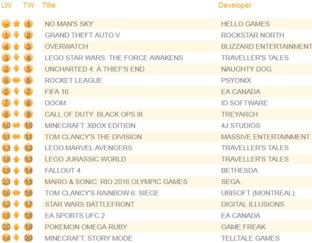 Компания Chart-track опубликовала свежие данные о продажах игр на территории Соединённого королевства. Первую строчку ожидаемо заняло космическое приключение No Man’s Sky. Причём игра продемонстрировала второй результат среди всех проектов, изданных Sony на PS4. No Man’s Sky уступила только Uncharted 4: A Thief’s End – игре, которая показала лучший старт среди проектов изданных Sony для PS4.