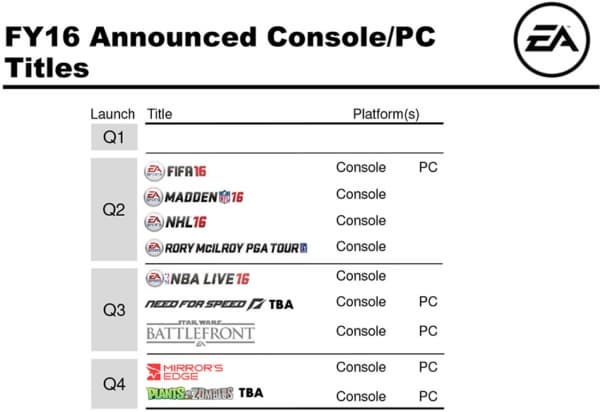 В третьем квартале финансового года ожидается релиз пока не анонсированной новой части Need for Speed, а также Star Wars: Battlefront. А в первом квартале следующего календарного года издатель планирует выпустить новые Mirror’s Edge и Plants vs. Zombies.