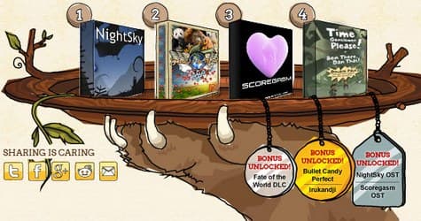 Теперь же вы получаете следующие бонусы: саундтреки для NightSky и Scoregasm, DLC для Fate of the World, а также новые игры Irukandji и Bullet Candy.
