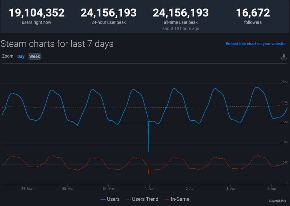 В середине марта в Steam в определённый момент находилось около 20,3 миллионов пользователей.