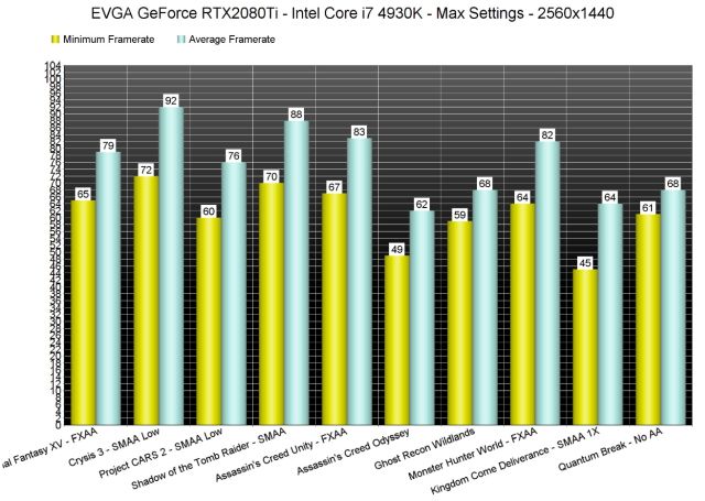 Игры: Crysis 3, Final Fantasy XV, Project CARS 2, Quantum Break, Assassin’s Creed Odyssey, Assassin’s Creed Unity, Ghost Recon Wildlands, Monster Hunter World, Kingdom Come Deliverance и Shadow of the Tomb Raider. Во всех играх включены Ultra-настройки, сглаживание понижено до разумных параметров и удалены эффекты NVIDIA Gameworks для проектов, которые их поддерживают. Игры протестированы в разрешениях 1440р (1440х2560), 1871р (1871х3325) и 4К (2160х3840).