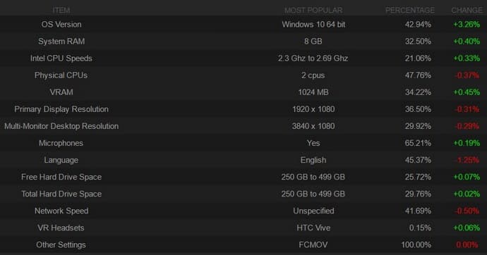 Ежемесячно компания Valve обновляет статистику, которая демонстрирует какие комплектующие и операционные системы используются в компьютерах пользователей сервиса Steam.