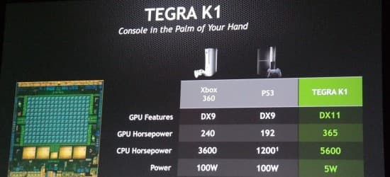 Генеральный директор компании Nvidia Дженсен Хуанг (Jen-Hsun Huang), анонсировав новый мобильный процессор Tegra K1, заявил, что он превосходит по мощности домашние консоли PS3 и Xbox 360.