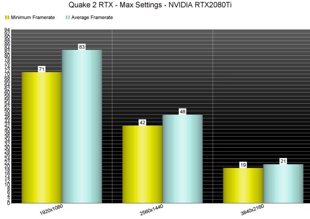 Издание DSO Gaming протестировало Quake 2 RTX на РС, оснащённом процессором Intel i7 4930K (4.2 ГГц), 16 ГБ памяти DDR3 и видеокартой GeForce RTX2080 Ti.