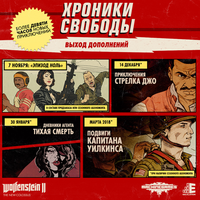 Студия MachineGames и Bethesda опубликовали даты выхода и названия дополнений «Хроники свободы» для шутера Wolfenstein II: The New Colossus. DLC входят в состав сезонного абонемента, который стоит 699 рублей.