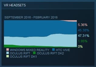 Ранее лидером была HTC Vive. Обе гарнитуры за последний год заметно подешевели. За последнее время Rift подешевела на $100 и сейчас её цена составляет $399. Месяцем ранее цена на Vive снизилась с $799 до $599. В целом около 0,28% пользователей Steam отмечают, что у них есть VR-устройство, подключаемое к PC.