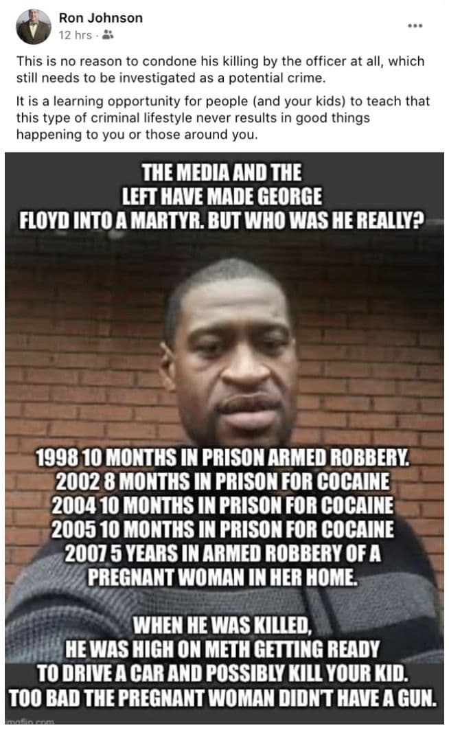 «Это ни в коем случае не оправдание убийства, которое совершил полицейский. Это необходимо расследовать как возможное преступления. Это может стать уроком для людей (и ваших детей) о том, что криминальный стиль жизни не приводит ни к чему хорошему, ни для вас, ни для тех, кто вас окружает», - написал Рон Джонсон