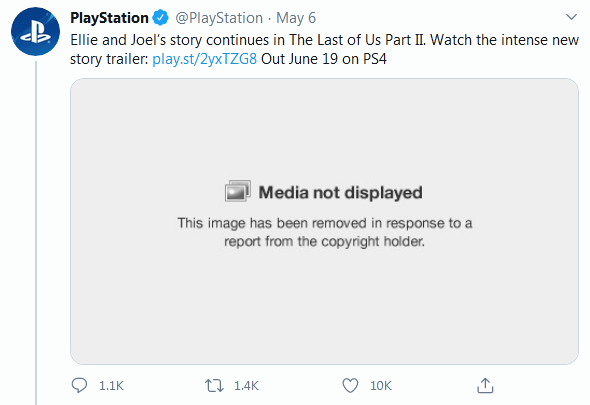 6 мая в твитере PlayStation появилось сообщение о том, что был опубликован новый трейлер The Last of Us Part II. К твиту прилагалось изображение игры от студии Naughty Dog. Однако недавно картинка из сообщения пропала. Зато можно было увидеть заявление о том, что «изображение было удалено после жалобы правообладателя». По сути, Sony пожаловалась сама на себя.