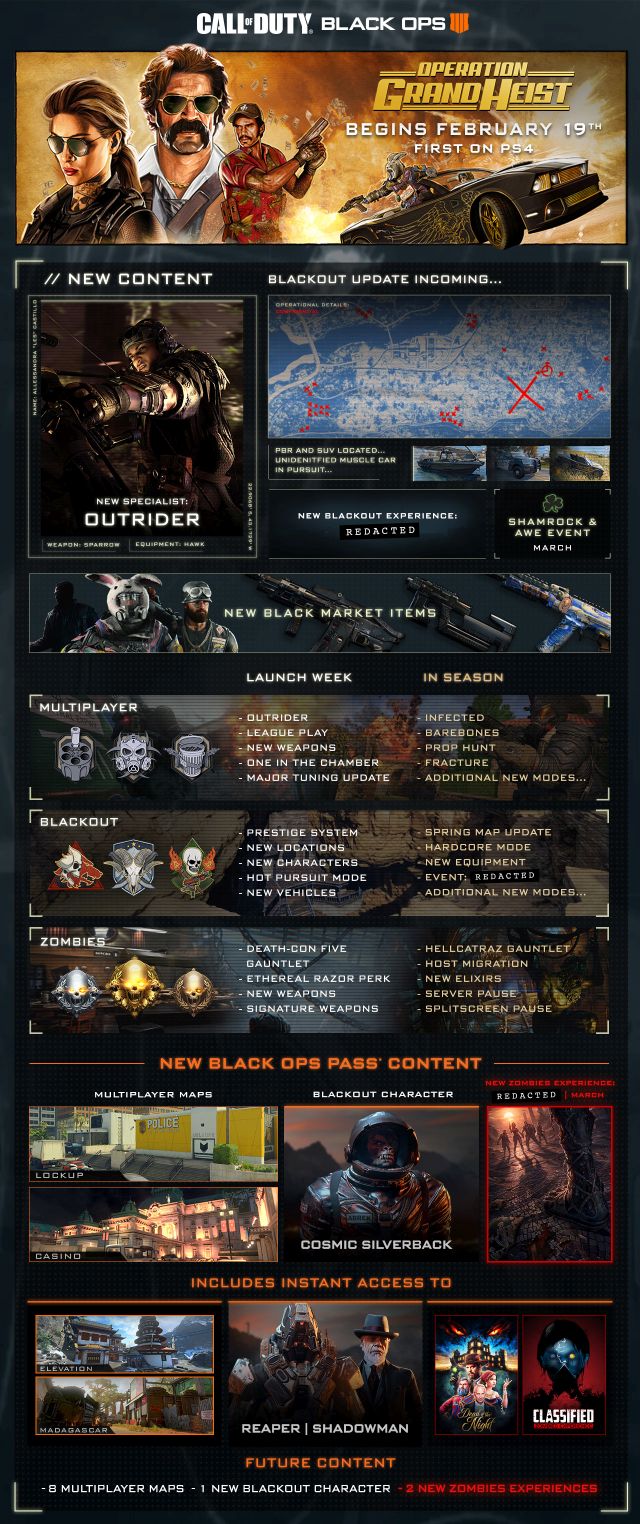 В игре появится новый специалист Outrider, нововведения и изменения коснутся карты «королевской битвы» Затмение, новый товар на «Чёрном рынке» со 100 новым уровнями, в сетевой игре появятся четыре карты – Lockup, Casino, Elevation, Madagascar, новый материал для Зомби-режима. Подробнее информация представлена на инфографике: