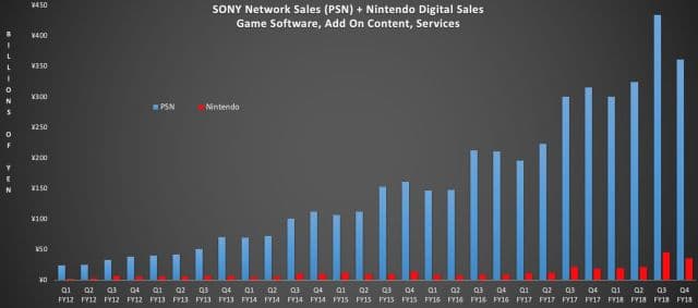 Аналитик Даниэль Ахмад опубликовал график, на котором сравниваются цифровые продажи Sony и Nintendo.