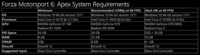 Microsoft и Turn 10 Studios сообщили о том, что открытое бета-тестирование гоночного симулятора Forza Motorsport 6: Apex начнется 5 мая этого года. Кроме того, были опубликованы официальные системые требования игры, которые запечатлены на следующей иллюстрации.