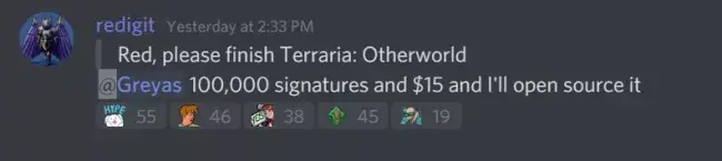 На сайте Change.org уже появилась петиция. Автор петиции хочет, чтобы создатели Terraria: Otherworld сделали исходный код проекта достоянием общественности. На момент публикации новости петицию подписало более 5,4 тысяч человек.