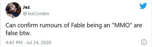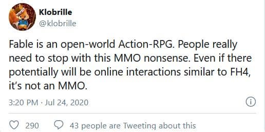 По словам информатора Klobrille новая часть Fable представляет собой «боевую ролевую игру в открытом мире», и людям стоит прекратить обсуждать глупости о ММО. Если в Fable и будут элементы онлайна, то в духе Forza Horizon 4 и только, отметил Klobrille.