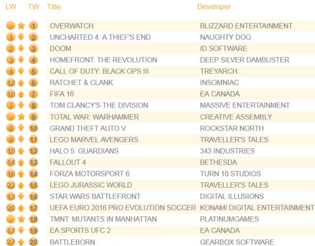Продажи Uncharted 4: A Thief’s End упали на 37%, а последняя глава приключений Натана Дрейка опустилась на вторую строчку. Вслед на ней расположился шутер DOOM, продажи которого упали на 41%. На четвёртом месте находится шутер в открытом мире Homefront: The Revolution (-41%). Продажи ремейка Ratchet & Clank подскочили на 114% благодаря выгодным предложениям от торговых сетей.