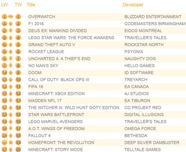 На первом месте остался командный сетевой шутер Overwatch, хотя продажи игры упали на 42%. С четвёртой на вторую строчку поднялся симулятор «Королевских гонок» F1 2016 (-48%). Приключенческий боевик Deus Ex: Mankind: Divided опустился со второй на третью позицию (-58%). На девятое место взобрался шутер DOOM (-23%).