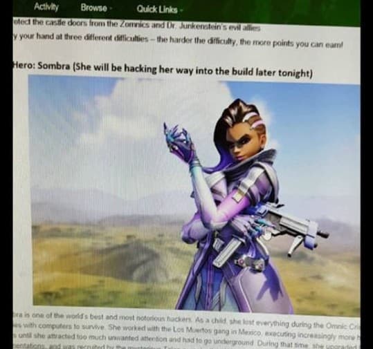 На новостном сайте Reddit появился скриншот из внутренней сети компании Blizzard, на котором изображён, со слов человека, опубликовавшего новость, новый персонаж Overwatch – Сомбра. Еще до появления этой новости в августе игроки обнаружили данную фотографию и биографию этого героя, а также примерную дату появления в игре, и очень возможно, что её представят на этой неделе.