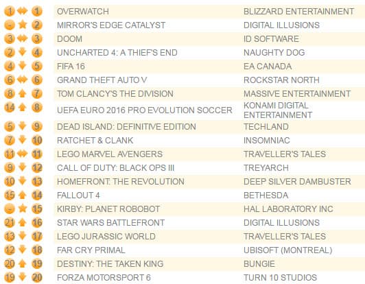 Doom занимает третье место также в третий раз подряд, а четвертая часть Uncharted переместилась на четвертое место. Начало Чемпионата Европы по футболу подкинуло футбольный симулятор UEFA Euro 2016 Pro Evolution Soccer на восьмую позицию. Новый платформер Kirby: Planet Robobot для 3DS занял 15 место.