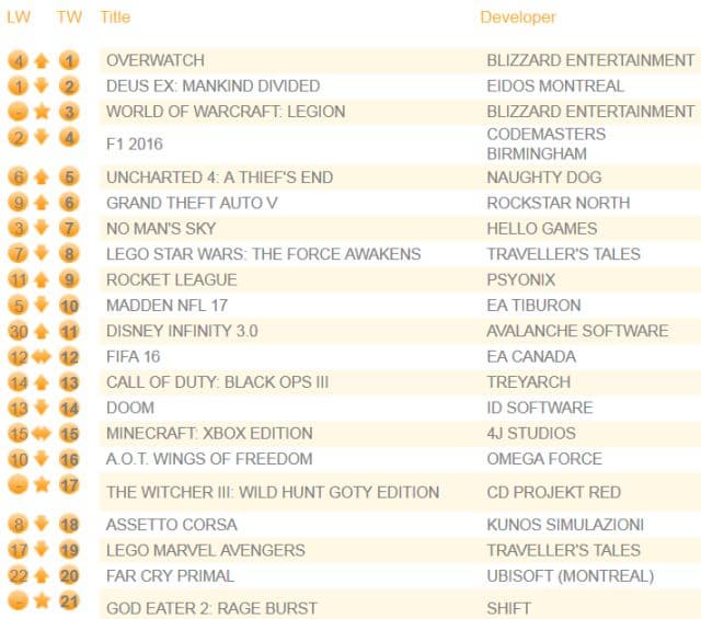 Компания Chart-track опубликовала свежие данные о продажах игр на территории Соединённого королевства. На первое место вернулся сетевой командный боевик Overwatch. Продажи игры выросли на 24% благодаря скидкам. На третьем месте расположился ещё один проект от Blizzard – дополнение для World of Warcraft под названием Legion. Это дополнение стартовало хуже предыдущего (Warlords of Draenor).