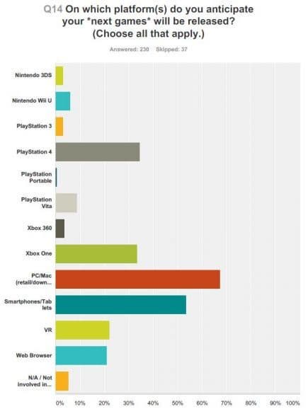 67% опрошенных заявили, что их игры выйдут на РС, 46% - что последняя выпущенная игра появилась на РС. На втором месте оказались смартфоны и планшеты, для которых делают игры более 50% европейских разработчиков. Третье и четвертое места занимают PS4 и Xbox One с резльтатами 20% и 23%, соответственно.