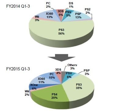 РС практически догнала Xbox 360 (11%), а также значительно опередила Wii (2%), 3DS (4%), PSP (3%) и PS Vita (6%). Наибольший вклад в доход издательства вносят игры для PS3 и PS4 - 35% и 20%, соответственно.