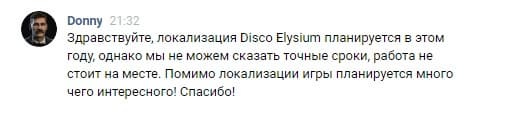 Пользователь форума Zone of Games с ником DMBidlov опубликовал скриншот ответа, который дал представитель студии ZA/UM, выпустившей Disco Elysium, на вопрос о сроках локализации продукта на русский язык.